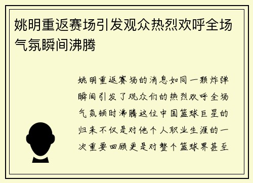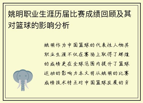 在中国篮球的历史长河中,姚明与王治郅的友谊和合作成为了无数球迷心中难以磨灭的印记。两位巨星不仅在赛场上相互激励、共同成长,更在生活中建立了深厚的友情。本文将从四个方面深入探讨姚明对王治郅篮球岁月的深情回忆,包括他们的初识与默契、共同奋斗的艰辛、友谊中的点滴瞬间,以及对彼此职业生涯影响的重要性。通过这些细节,我们能够更好地理解这段珍贵友谊背后的故事,也能感受到体育精神所带来的力量。 1、初识与默契...